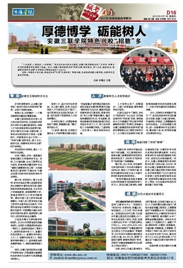 记者在走访中了解到,该校以“院所结合”为立足点,利用省会城市的“科技城”的优势,借助政府大力开展建设“皖江城市带承接转移示范区”的契机,积极参与安徽三联集团向科技部申报“国家车辆驾驶安全工程技术研究中心”,大力强化社会服务功能,积极将我院教学科研成果转化推广,为地方经济建设和发展做出贡献。