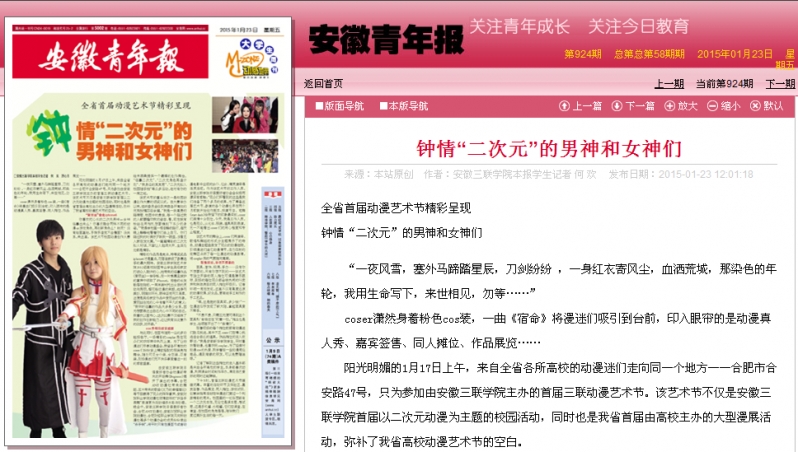 阳光明媚的1月17日上午,来自全省各所高校的动漫迷们走向同一个地方——合肥市合安路47号,只为参加由米兰app下载免费安装手机版主办的首届三联动漫艺术节。该艺术节不仅是米兰app下载免费安装手机版首届以二次元动漫为主题的校园活动,同时也是我省首届由高校主办的大型漫展活动,弥补了我省高校动漫艺术节的空白。