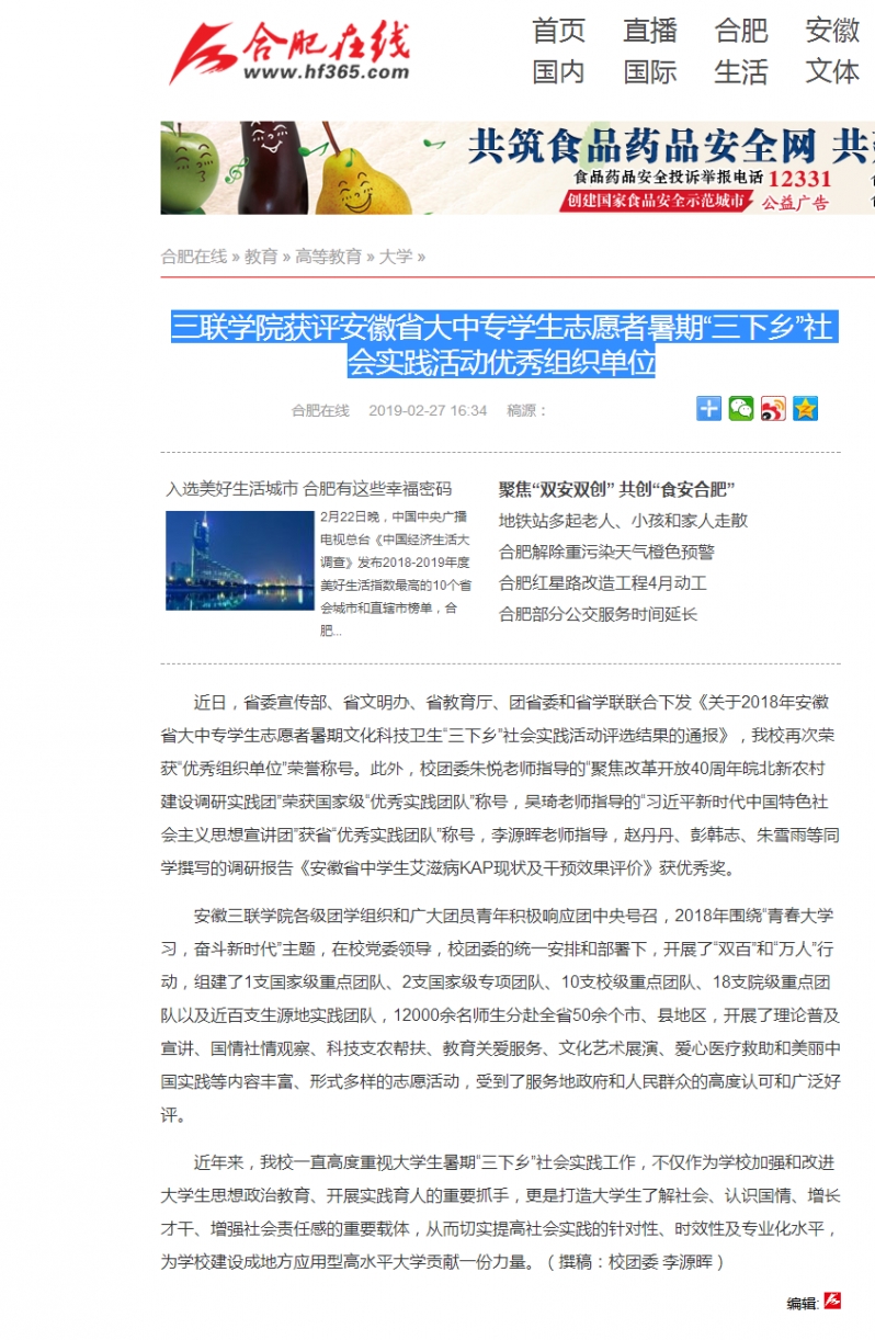 合肥在线:三联学院获评安徽省大中专学生志愿者暑期“三下乡”社会实践活动优秀组织单位