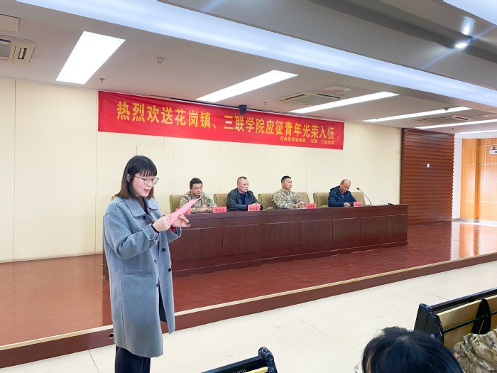 3月14日,我校2024年春季入伍学生欢送会在肥西县人武部七楼会议室举行。肥西县人民武装部副部长代松贤、肥西县花岗镇人民武装部副部长郭祖星,学生处副处长、校征兵工作站站长潘玉廉,辅导员代表、家长代表以及全体入伍新兵参加了欢送会,会议由潘玉廉主持。