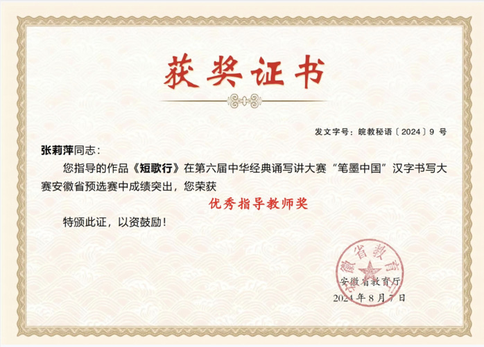 近日,安徽省教育厅公布了第六届中华经典诵写大赛省赛获奖名单。我校学子在文学部的组织宣传下,积极响应,热情参与,取得了优异成绩。汪子涵同学的《短歌行》在“笔墨中国”汉字书写大赛省赛中获一等奖,并进入全国决赛;张扬同学的《桃花源记》获三等奖。李畅、莫星月同学的《破晓的曙光》在“诵读中国”经典诵读大赛省赛中获二等奖;孙佳智、张睿彤同学的《生如胡杨》以及董倩倩、陈婷婷同学的《永生的和平鸽》同时获得三等奖。文学部张莉萍老师获优秀指导教师奖。
