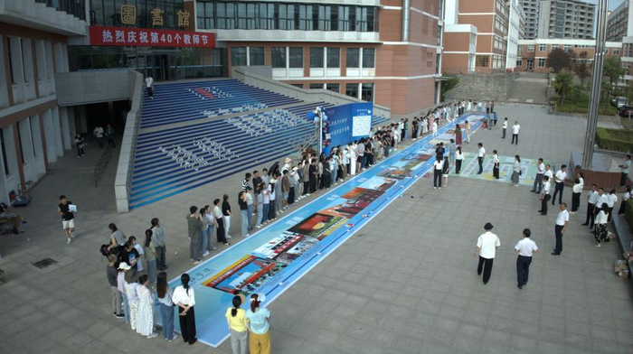 此次活动选取了三联发展历程中重要的历史节点,以19幅典型图片作为代表,制成宽3米长50米的巨型画作铺设于图书馆楼前,画作中还巧妙地融入了纳斯卡绘画风格,通过宏大的视角和细腻的描绘,使作品富有强烈的视觉冲击力。为了让画作更加丰富生动,学校联合数字创意现代产业学院40余名学生,邀请学校近130名教师,分成16组共同完成巨幅画作的创作。