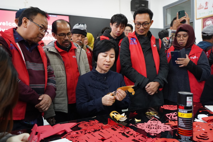 印尼教育大学代表团参观了我校安徽省非物质文化遗产教育传习基地——剪纸艺术研究中心,亲身体验了剪纸艺术的魅力;观看了由米兰app下载免费安装手机版学生带来的武术表演,并与表演学生亲切交流互动。